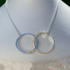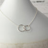 A beautiful yet simple necklace comprising a pair of sterling silver interlinked rings on a sterling silver chain. Both rings are identically sized and have been individually textured by hand with a hammered finish to create really bright facets to catch and reflect the light.