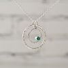 A deep green Emerald gemstone set in silver and mounted at a slightly offset angle on an hammered silver ring, suspended within another larger hammered ring. This fine gemstone measures around 4mm in diameter and is set in an open-backed tube setting that allows light in to show of the stone's beautiful colour.