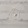 A single indigo-coloured Tanzanite gemstone set in silver and mounted at a slightly offset angle on an hammered silver ring, suspended within another larger hammered ring. This fine gemstone measures around 4mm in diameter and is set in an open-backed tube setting that allows light in to show of the stone's beautiful colour.