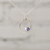 A stunning indigo-coloured Tanzanite set in silver and mounted at a slightly offset angle on an hammered silver ring. This fine gemstone measures around 4mm in diameter and is set in an open-backed tube setting that allows light in to show of the stone's beautiful colour.